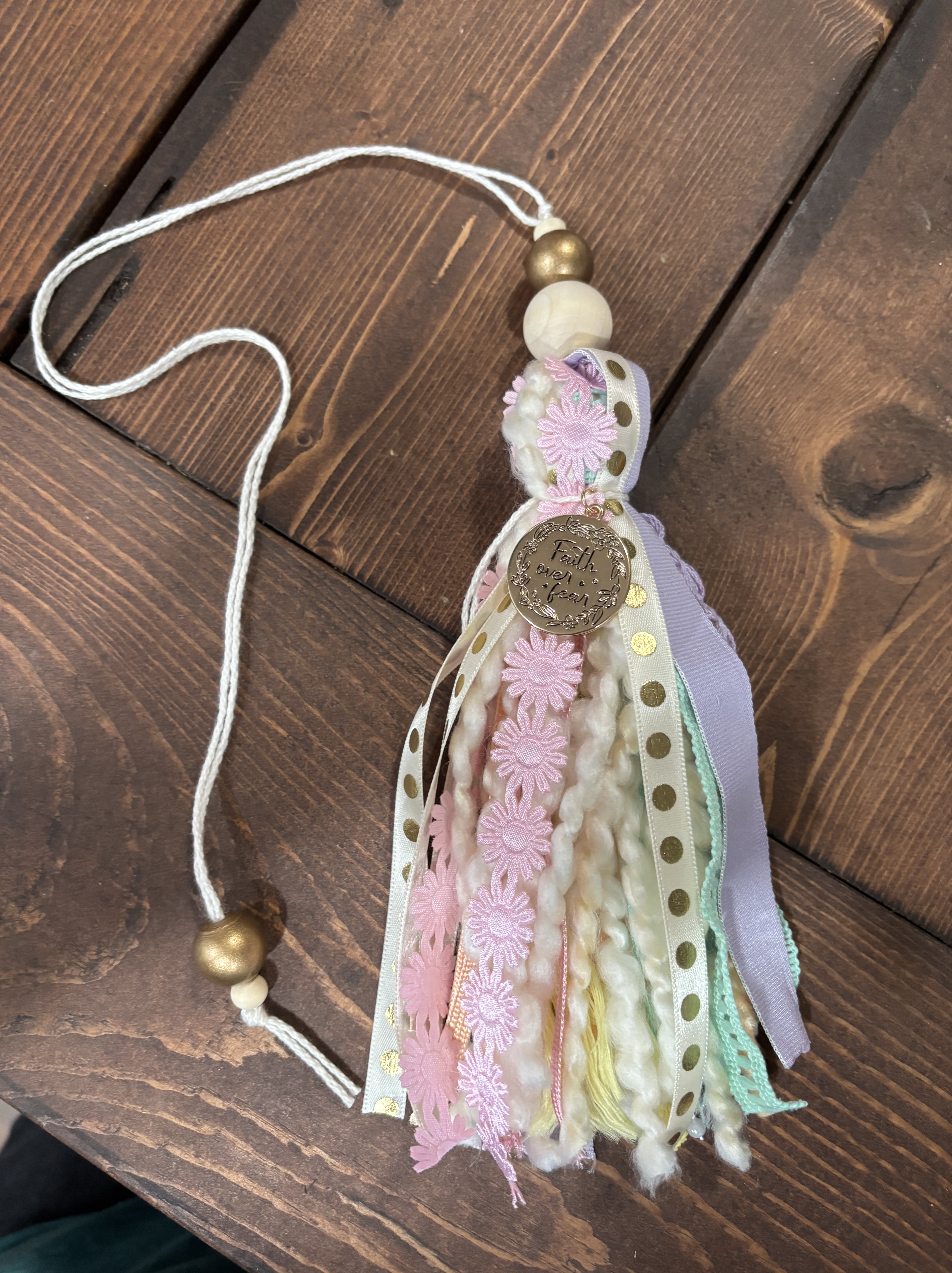 When we arrived, the craft supplies were on the table and she explained what each was for and then started us on our projects. We each selected our beginning yarn, ribbons, lace and got started cutting our selections to the desired length. We then selected a charm and some beads to finish the tassels. I had a blast. It had been a long time since I had spent time crafting. My daughter did an excellent job in selecting, supplying and leading us through the process. She took me out of my comfort zone and did so with grace.